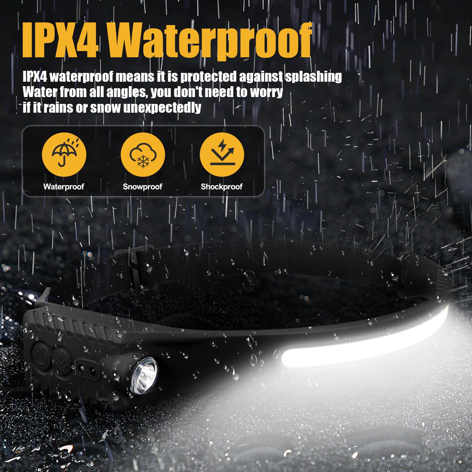 With an IPX4 waterproof rating, this headlights for head is protected against rain and snow, guaranteeing reliable performance in any weather.