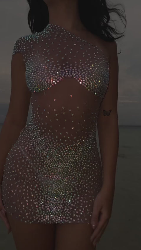 Meghyn One Shoulder Rhinestone Mini Dress – Elegant & Dazzling Statement Wear